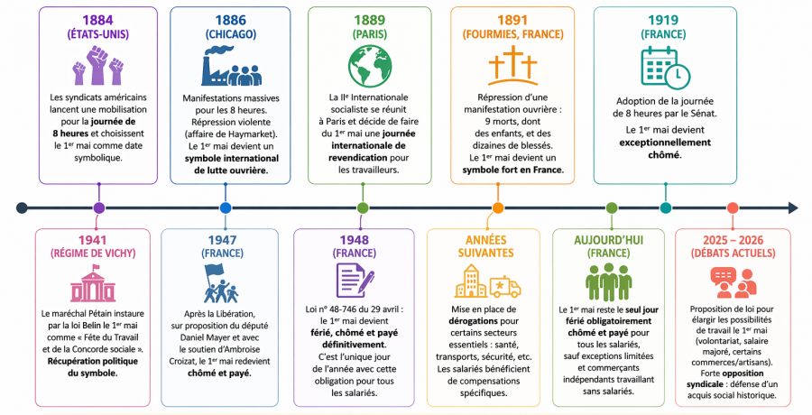 Aujourd’hui, le 1er mai reste une journée protégée : le travail est interdit, sauf dans certains secteurs essentiels, et les commerçants indépendants peuvent ouvrir sans salariés.