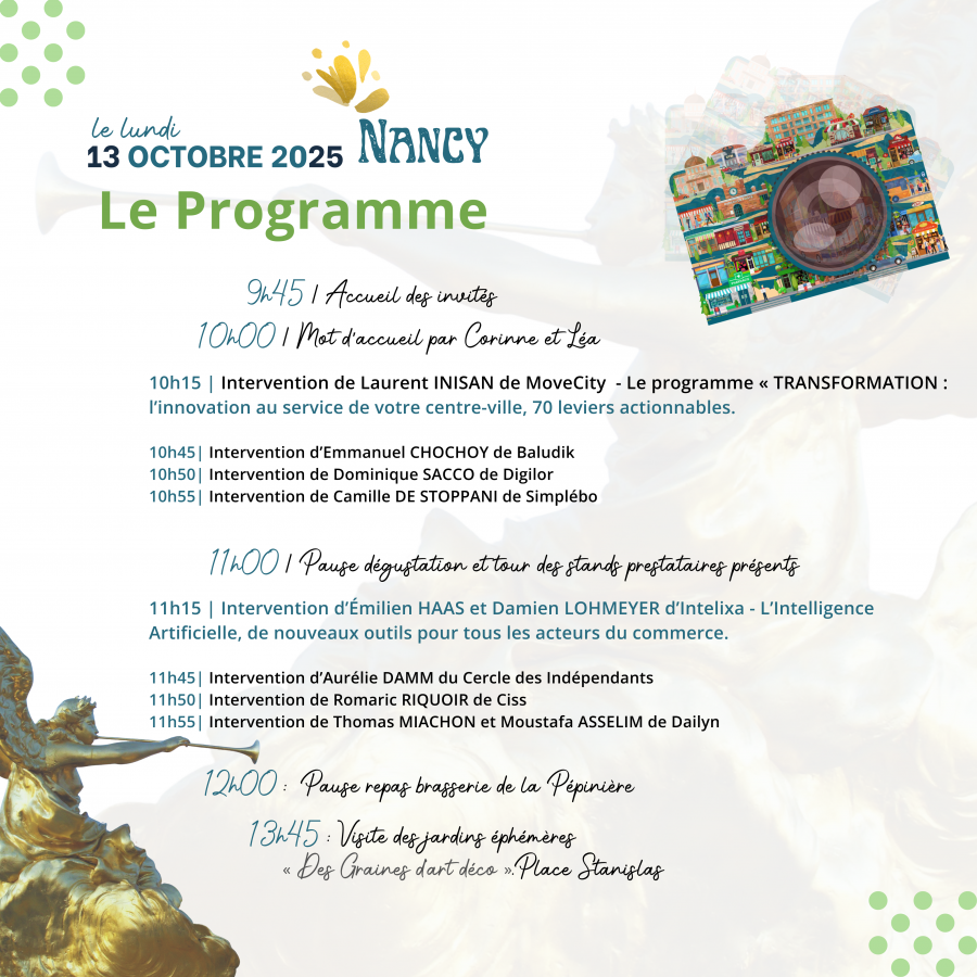 Nous nous retrouverons lundi 13 octobre à Nancy pour un temps de partage autour de la Remise de Prix aux lauréats de l'Édition 2025 de notre jeu concours “Les plus beaux centres-villes commerçants” !